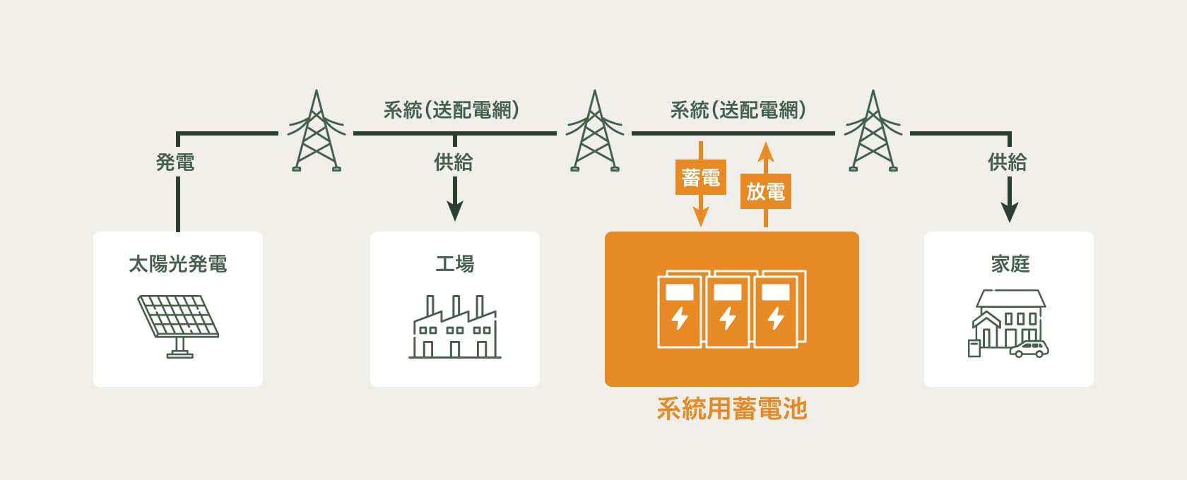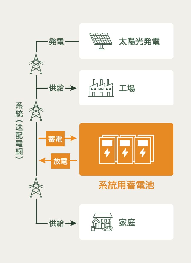 系統用蓄電池とは、蓄電池を活用することにより電力需要が少ない時間帯に余った電力を蓄え、需要が増える時間帯に放電することで、電力の需給バランスを整える装置です。これにより、発電量の安定しない再エネ電力の有効活用が可能となります。大規模な停電を防ぎ、電力の安定供給が可能です。