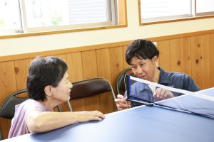 早速、卓球台を組み立て、短い時間ながらも自治体のみなさまと試合を楽しむことができました。