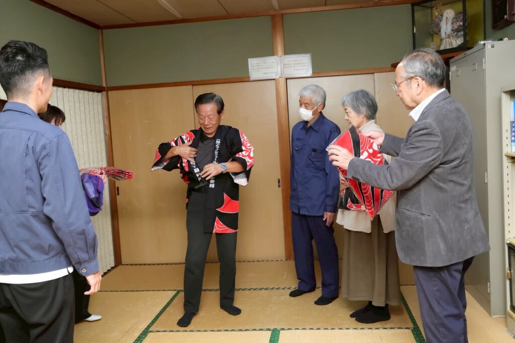 自治会のみなさんが法被に腕を通し、楽しそうに会話されている姿を見て